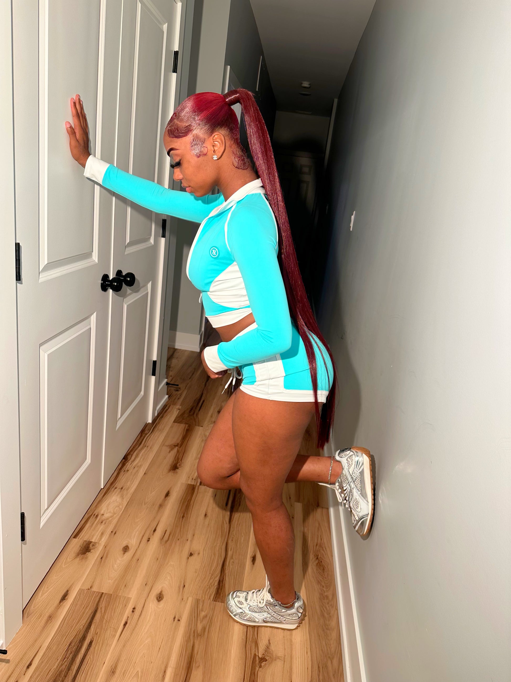 This set includes a fitted zip-up jacket, a supportive bralette, and high-waisted drawstring shorts.